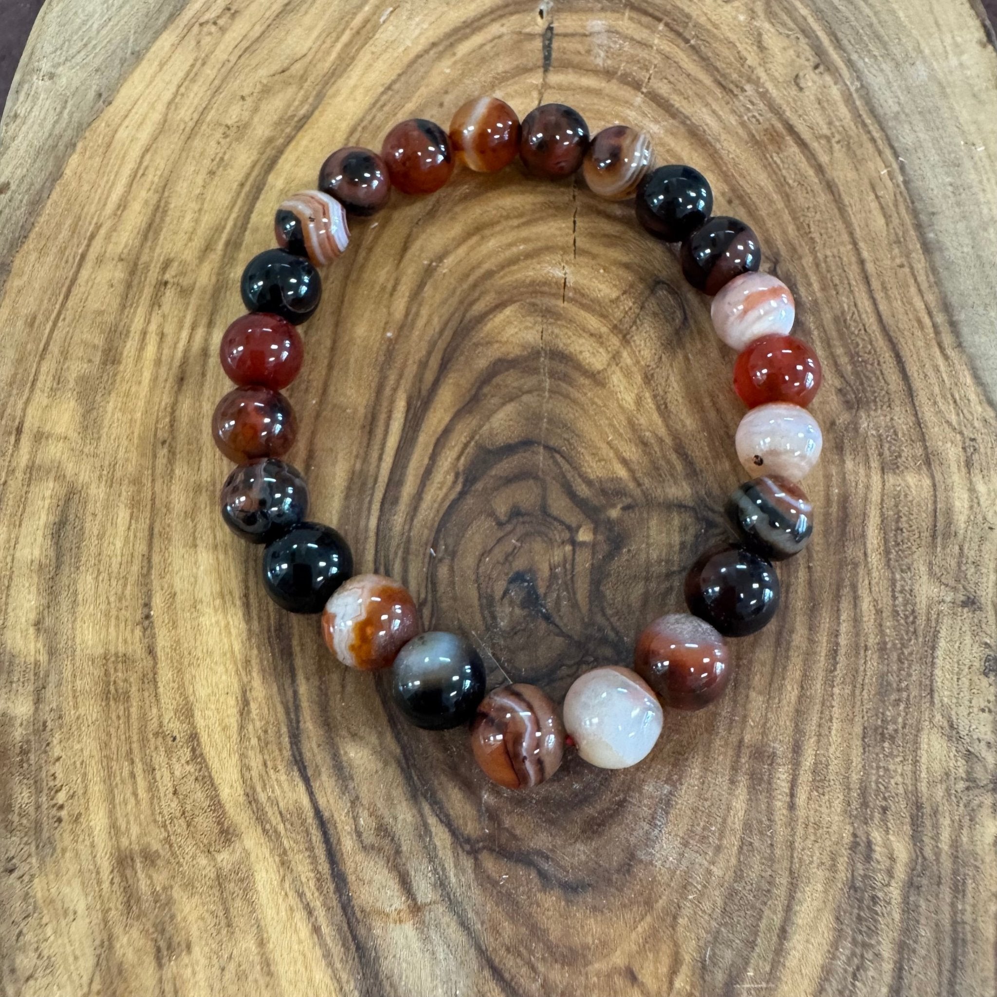 The Sardonyx Beaded Bracelet 8mm is a grounding stone that promotes strength, courage, and stability.